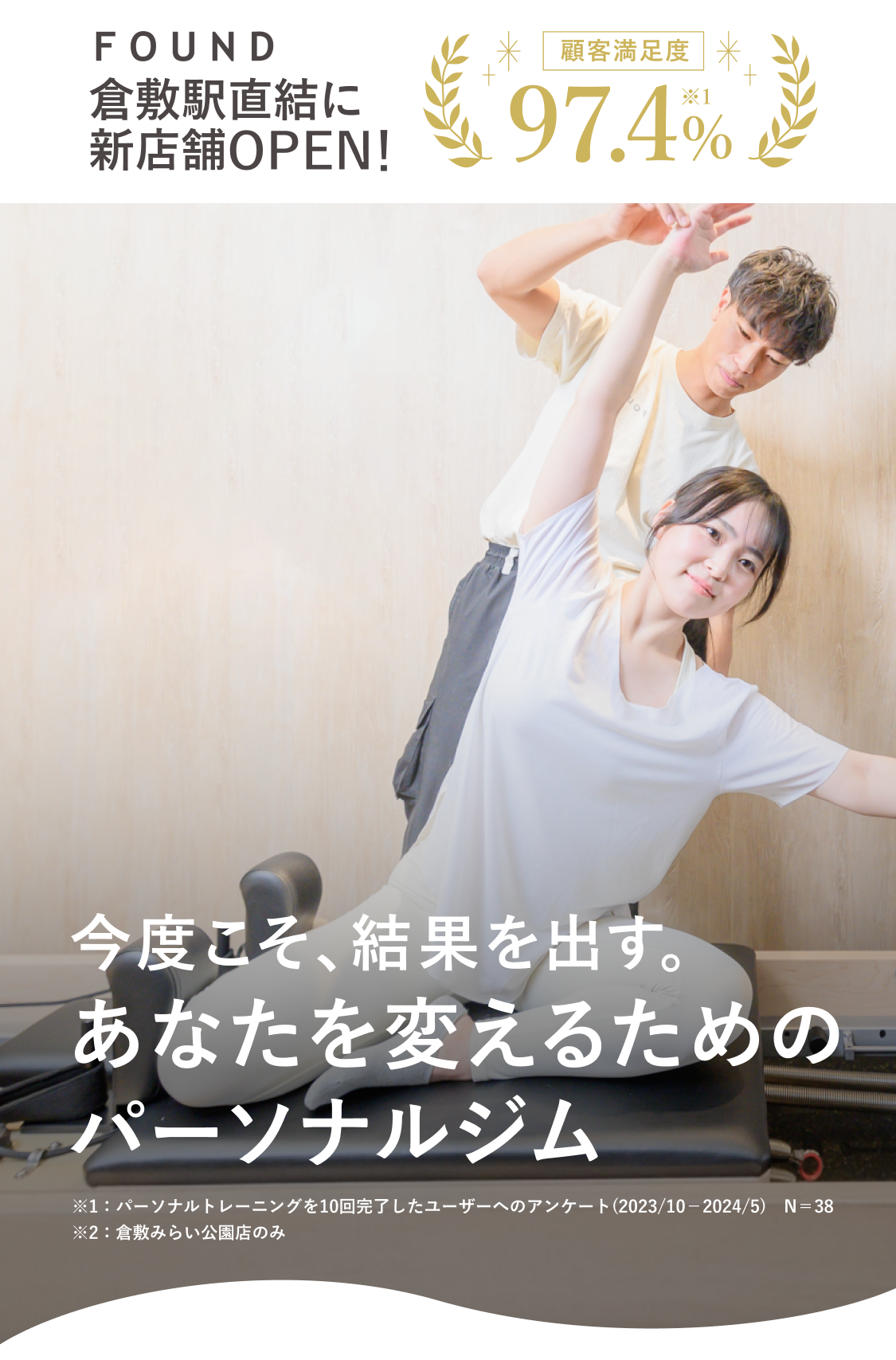 筋トレだけが、ダイエットの答えじゃない。 FOUNDでは、その日のコンディションに合わせて ヨガ・マッサージ・整体・ピラティスもお選びいただけます。 鍛えるだけでなく、“整える”ことでカラダのバランスを調整し、より効率的に無理のない理想のボディラインへ。 リラックスできる環境だから気持ちもリフレッシュ。 FOUNDに通い 「続けること」が自然と習慣に!